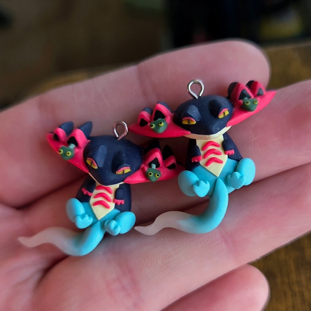 Each piece is handmade out of polymer clay, and coated in a protective, shiny resin.